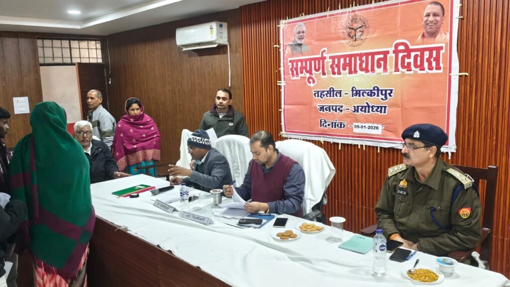 अयोध्या। मिल्कीपुर तहसील सभागार में सोमवार को संपूर्ण समाधान दिवस का आयोजन किया गया, जिसकी अध्यक्षता अपर जिलाधिकारी (वित्त एवं राजस्व) अमित भट्ट ने की। समाधान दिवस के दौरान कुल 143 शिकायती प्रार्थना पत्र प्राप्त हुए, जिनमें से 12 शिकायतों का मौके पर ही निस्तारण किया गया। शेष प्रकरणों के संबंध में अपर जिलाधिकारी ने संबंधित अधिकारियों को गुणवत्तापूर्ण एवं समयबद्ध निस्तारण सुनिश्चित करने के निर्देश दिए।