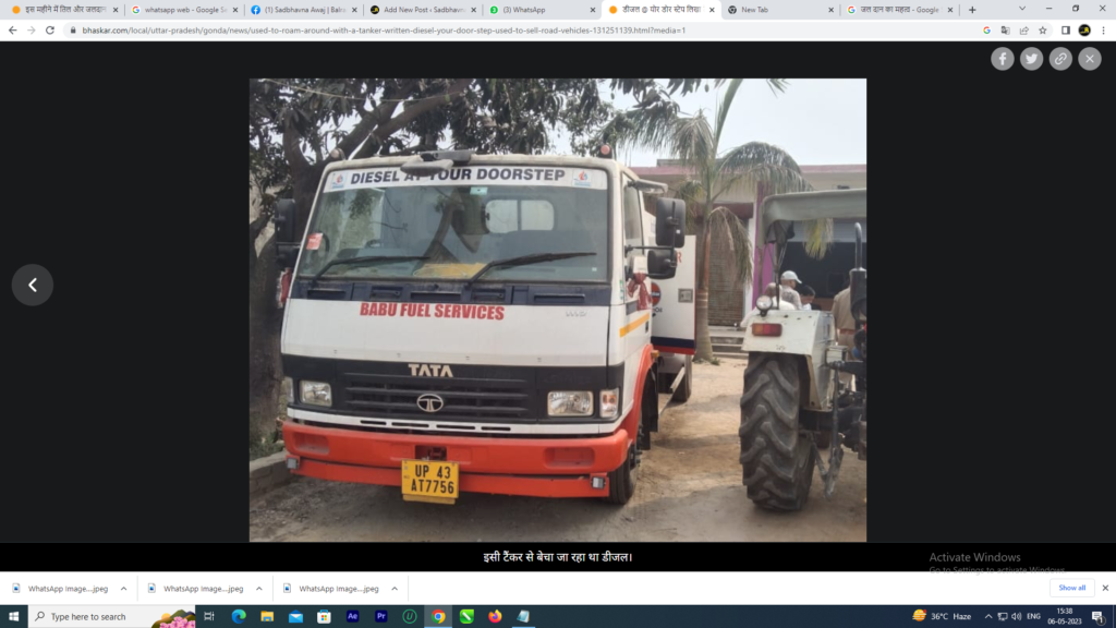 बाबू फ्यूल सर्विसेस प्रा.लि. के वाहन से इंडियन ऑयल के गोंडा डिपो के बजाय पेट्रोल पंप से डीजल खरीदकर बिना फुटकर डीजल बिक्री लाइसेंस के टैंकर में डीजल भंडारित कर आजाद नगर बाजार में 90.90₹ प्रति लीटर डीजल की बिक्री की जा रही थी। थाना प्रभारी खोड़ारे सुरेश वर्मा ने बताया कि टैंकर को कब्जे में लिए लिया गया है।