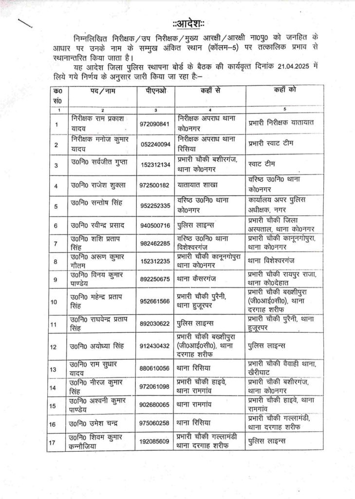 उपनिरीक्षक राम सुधार यादव थाना रिसिया से चौकी प्रभारी वैवाही,नीरज सिंह को चौकी प्रभारी हाइवे से चौकी प्रभारी बशीरगंज,अश्वनी पाण्डेय को थाना रामगांव से चौकी प्रभारी चौकी हाइवे,उमेश चन्द्र को थाना रिसिया से चौकी प्रभारी गल्लामंडी,शिवम कनौजिया को चौकी प्रभारी गल्लामंडी से पुलिस लाइन,अशोक जायसवाल को चौकी प्रभारी तिकोनीबाग से पुलिस लाइन,अजय कुमार सिंह को पुलिस लाइन से चौकी प्रभारी तिकोनीबाग, धीरेन्द्र कुमार को थाना पयागपुर से चौकी प्रभारी जिला जेल,शिवम त्रिपाठी को चौकी प्रभारी जिला जेल से पुलिस लाइन,रवि यादव को थाना जरवल रोड से चौकी प्रभारी रोडवेज,अभिलाख सिंह को चौकी प्रभारी रोडवेज से चौकी प्रभारी चितलहवा,हे. का.अजीत चन्द्र,का.विष्णु प्रताप सिंह,राहुल बाजपेयी,अंकुर यादव,अमित कुमार यादव को स्वाट टीम में तैनात किया है।