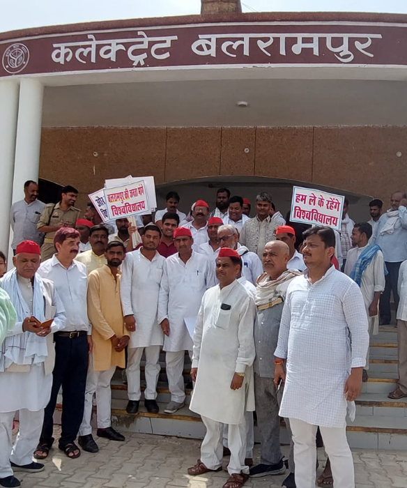 एक विशेष समूह की राजनीति करने वाली समाजवादी पार्टी, कांग्रेस, एआईएमआईएम आज एक साथ बलरामपुर में मां पाटेश्वरी विश्विद्यालय की मांग को लेकर “माता जी से यही पुकार विश्वविद्यालय मां के द्वार” नारा लगाती दिखी। दरासल मामला जनपद मुख्यालय बलरामपुर का है जहां बलरामपुर में मां पाटेश्वरी विश्व विद्यालय की स्थापना कराए जाने की मांग को लेकर चल रहा आंदोलन तेज होता जा रहा है। विश्व विद्यालय की स्थापना की मांग को लेकर आज सर्वदलीय पार्टी के नेताओं ने कलेक्ट्रेट के पास धरना देकर सत्यागृह आंदोलन की शुरुआत की।