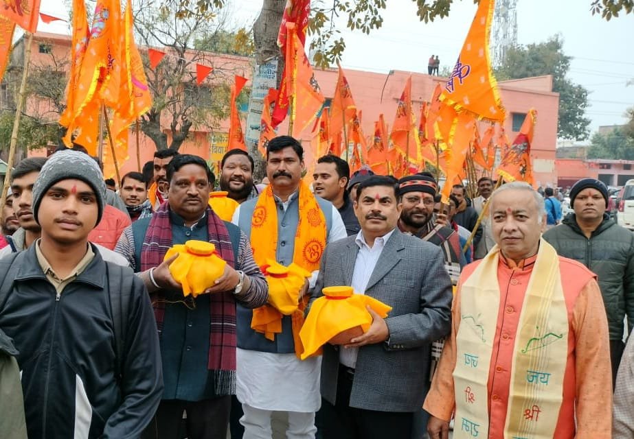 जनपद बलरामपुर में विश्व हिंदू परिषद के नेतृत्व में व आर एस एस,एकल विद्यालय अभियान द्वारा जुलूस निकाला गया व जय श्री राम के नारों के साथ हजारों की संख्या में लोगों ने इस यात्रा में हिस्सा लिया.विभिन्न मंदिरों से शुरू हुई अक्षत कलश यात्रा में शामिल महिलाएं अपने सिर पर कलश उठाए नाचते और झूमते हुई दिखाई दीं विश्व हिंदू परिषद की तरफ से इस यात्रा का भव्य आयोजन किया गया.आयोजकों ने इस अक्षत कलश शोभा यात्रा को निकालने के लिए विशेष इंतजाम किए थे.इन्हीं महिलाओं ने इसी कलश यात्रा को आगे बढ़ाते हुए पूरे शहर की परीक्रमा की.