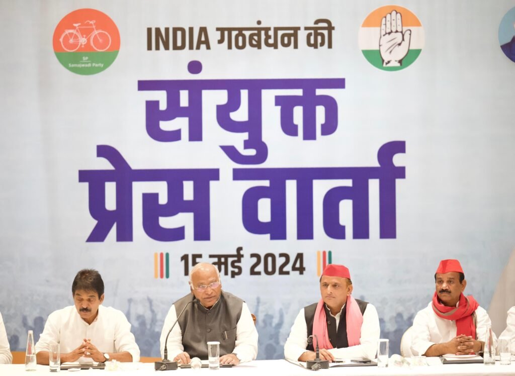 बुधवार को इंडिया गठबंधन की संयुक्त प्रेस कॉन्फ्रेंस किया गया। इसमें कांग्रेस अध्यक्ष मल्लिकार्जुन खड़गे और सपा अध्यक्ष अखिलेश यादव मौजूद रहे। खड़गे ने कहा- देश में दो विचारधाराओं की लड़ाई है। अभी तक के चार चरणों के चुनाव में इंडिया गठबंधन मजबूत दिख रहा है। मोदी की सरकार इस बार नहीं बनेगी। इंडिया गठबंधन की सरकार बनने जा रही है। अखिलेश यादव ने बीजेपी पर जमकर आरोप लगाए। उन्होंने कहा – 10 साल दिल्ली और 7 साल यूपी की सरकार में झूठे वादे किए। इंडिया गठबंधन उत्तर प्रदेश में 79 सीटें जीत रहा है। वाराणसी का इशारा करते हुए कहा कि क्यूटो में लड़ाई है। ये 400 पार का नारा इसलिए दे रहे हैं, क्योंकि देश का संविधान बदलना चाहते हैं। ये पूरे देश की मिली-जुली तहजीब को बदलना चाहते हैं।