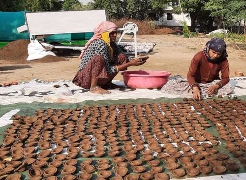 दीयों को आकर्षण बनाने में जुटी महिलाएं