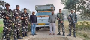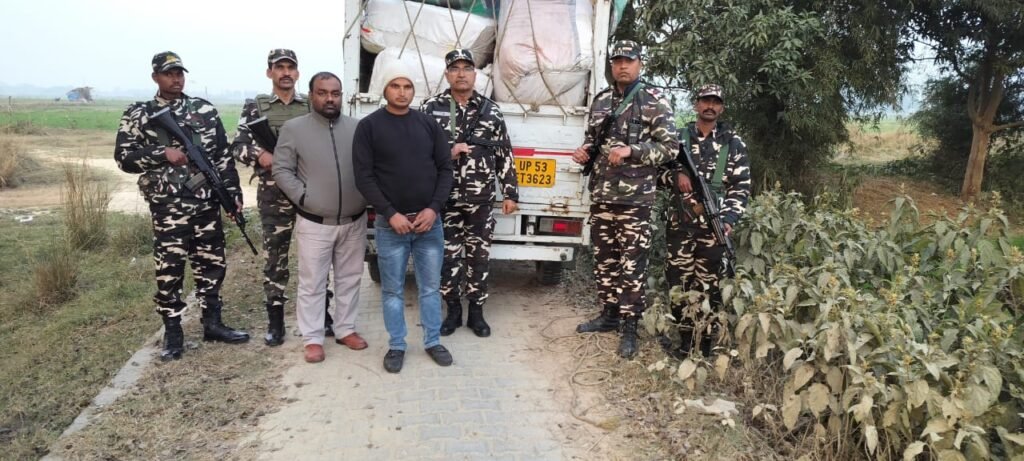 43वीं वाहिनी सशस्त्र सीमा बल सीमा चौकी अलिगढ़वा और सीमा शुल्क विभाग खुनुवा की संयुक्त गस्ती दल ने तस्करी के लिए ले जा रहे कपडे से भरे पीकप के साथ एक व्यक्ति को पकड़ा । जानकारी देते हुए श्री उज्जल दत्ता, कमांडेंट, 43वीं वाहिनी ने बताया की सुचना प्राप्त हुआ है कि बड़ी ठकुरापुर गाँव के रास्ते कपडे से भरी पीकप नेपाल तस्करी के लिए ले जाया जाने वाला है । सुचना प्राप्त होते ही सीमा चौकी अलिगढ़वा से निरीक्षक संपत सिंह के नेतृतव में उप निरीक्षक त्रिलोचन, मुख्य आरक्षी राजेश कुमार यादव, आरक्षी बसंता साहू और आरक्षी चावड़ा रवि कुमार तथा निरीक्षक अक्षय कुमार, सीमा शुल्क कार्यालय खूनुवा, सीमा स्तम्भ संख्या 549 के पास चिन्हित स्थान पर पहुच गए और देखा कि एक चार पहिया वाहन भारत से नेपाल सीमा की ओर आ रहा है I