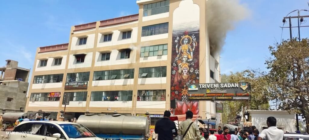दूसरी घटना सुबह करीब 10 बजे नगर कोतवाली क्षेत्र के अमानीगंज जलकल के सामने स्थित त्रिवेणी सदन की तीसरी मंजिल पर हुई। त्रिवेणी सदन की इस बिल्डिंग में कई दुकानें, मल्टीलेवल पार्किंग और लोगों के ठहरने की व्यवस्था है। आग लगने की सूचना पर फायर ब्रिगेड की तीन टीमें मौके पर पहुंचीं और काफी मशक्कत के बाद आग पर काबू पाया। तेज हवाओं की वजह से आग बुझाने में दिक्कत हुई।मुख्य अग्नि शमन अधिकारी महेंद्र प्रताप सिंह ने बताया कि आग तीसरी मंजिल के डोरमेट्री एरिया में लगी थी, जहां सभी दरवाजे बंद थे। फायर ब्रिगेड की टीम को दरवाजे तोड़कर भीतर घुसना पड़ा। शुरुआती जांच में आग लगने की वजह एसी के वायर में शॉर्ट सर्किट मानी जा रही है।अयोध्या विकास प्राधिकरण के सचिव सत्येंद्र सिंह ने कहा कि त्रिवेणी सदन को सभी जरूरी एनओसी लेकर बनाया गया था। बिल्डिंग के अग्निशमन उपकरण भी सही स्थिति में थे। सुखसागर हॉस्पिटैलिटी को इस बिल्डिंग के प्रबंधन की जिम्मेदारी दी गई थी। अगर सुखसागर की लापरवाही पाई गई तो जांच के बाद कार्रवाई होगी।
