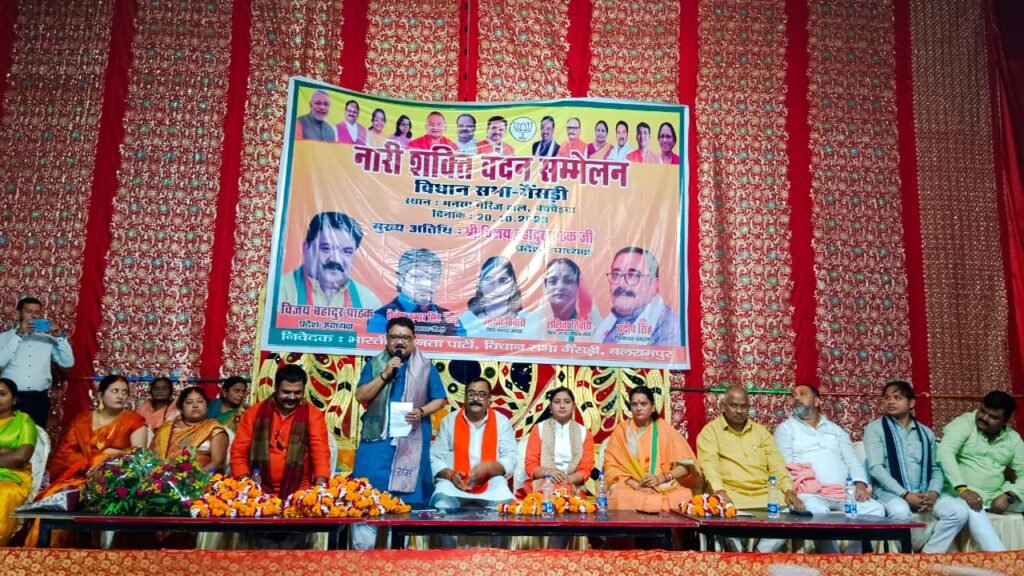 महिलाओं को विधानसभा और लोकसभा में नेतृत्व करने का मौका मिलेगा। उन्होंने कहा कि अच्छे कामों को लोगों तक पहुंचाए प्रधानमंत्री नरेन्द्र मोदी ने महिलाओं के उत्थान के तमाम जनकल्याणकारी योजनाओं की शुरुआत की है इसकी जानकारी बूथ बूथ तक महिलाओं तक पहुंचाएं। पूर्व विधायक शैलेष कुमार सिंह ‘शैलू’ ने मुख्य अतिथि व उपस्थित सभी लोगों के प्रति आभार व्यक्त किया। उक्त अवसर पर भाजपा जिलाध्यक्ष प्रदीप सिंह, अध्यक्ष जिला पंचायत आरती तिवारी, पूर्व विधायक शैलेष कुमार सिंह शैलू, ब्लाक प्रमुख मनोज तिवारी, नगर पंचायत अध्यक्ष पचपेड़वा रवि वर्मा, जिला अध्यक्ष महिला मोर्चा ललिता तिवारी, जिला महामंत्री रवि कुमार मिश्रा, श्याम मनोहर तिवारी, सहित भारी संख्या में महिलाएं व स्थानीय कार्यकर्ताओं की उपस्थिति रही।